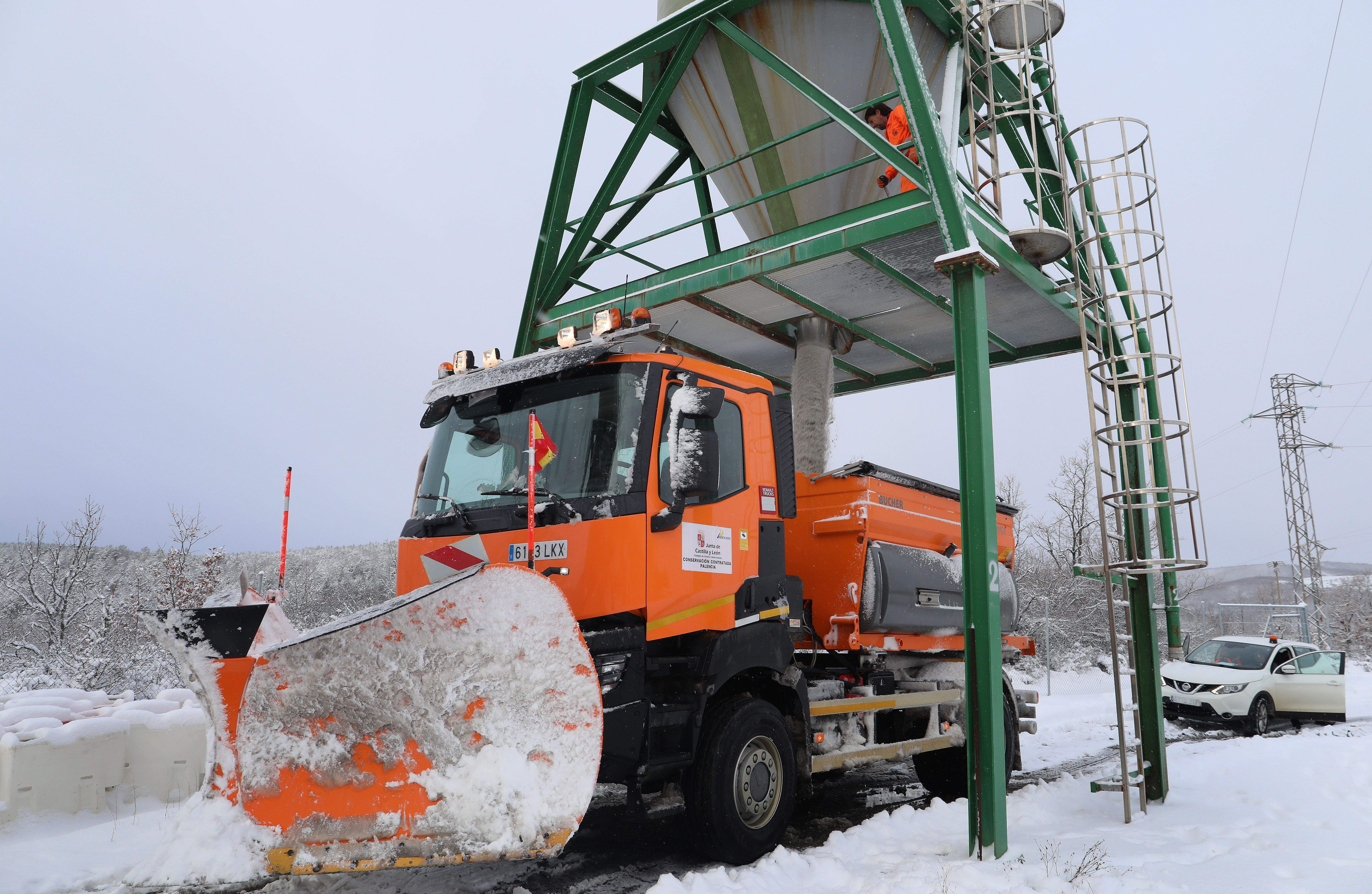Tras cargar el depósito del camión de sal en un silo, Romero se pone en marcha en la ruta asignada tras cinco años subido a un camión, prácticamente normal, al que le han incorporado una cuña, en la parte delantera, y un equipo de sal, en la parte trasera, para esparcir el fundente mientras se limpia la vía, al reconocer que la ruta de los pantanos o el Puerto de Piedrasluengas se erigen como zonas de actuación complicadas.