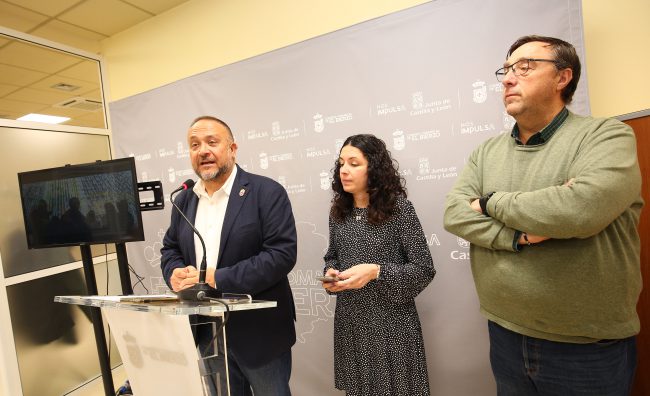 El presidente del Consejo Comarcal, Gerardo Álvarez Courel (I), junto al alcalde de Villafranca del Bierzo, José Manuel Pereira (D), durante la presentación de la campaña promocional de Turismo del Bierzo en InturEl Bierzo acude a la Feria de Turismo Interior (INTUR) que se celebra desde este jueves y hasta el domingo en Valladolid y lo hace con tres spots que animan a descubrir las riquezas del Bierzo y sus municipios. Este año, además del Consejo Comarca, Villafranca del Bierzo y Toral de los Vados también participan en la muestra con un vídeo cada uno. Así, 5 piezas audiovisuales invitarán a los asistentes a la feria a acercarse a la Comarca y disfrutar de los atractivos que ofrece.