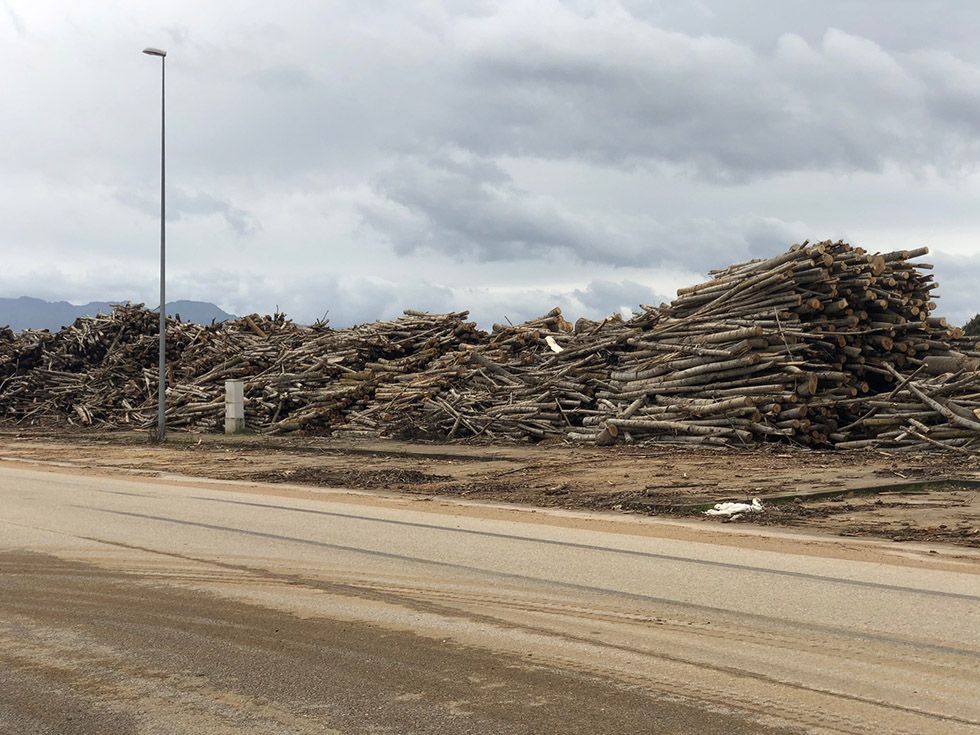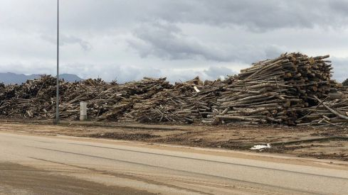 La planta de biomasa Forestalia, instalada en el polígono El Bayo de Cubillos del Sil, ya acumula madera. Durante varias parcelas, a lo largo de casi un kilómetro de avenida en el polígono, los restos forestales se acopian. En origen, serán cuarenta las pirámides que almacenarán casi cien mil metros cúbimos de este material. Unos terrenos (identificados con el numeral I-39 e I-40) que podrían llegar a albergar la nada despreciable cifra de 96.660 metros cúbicos de madera.