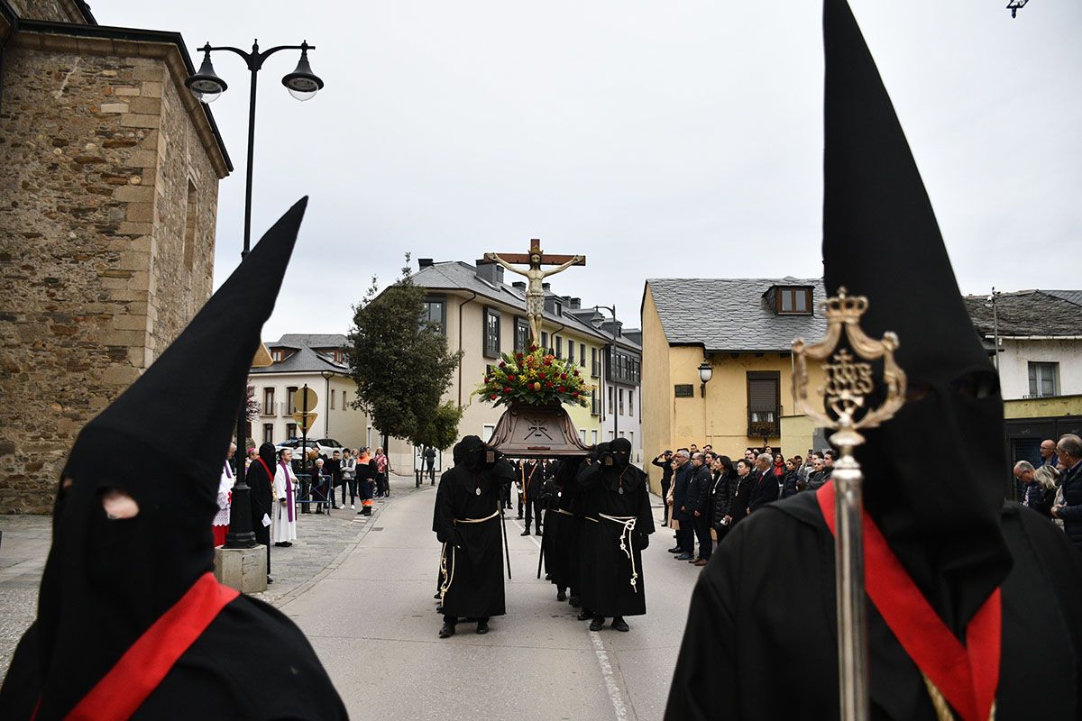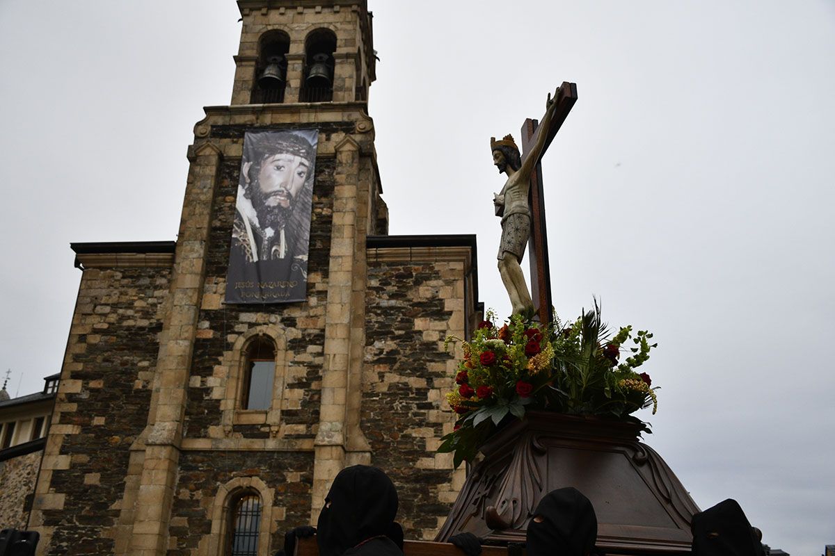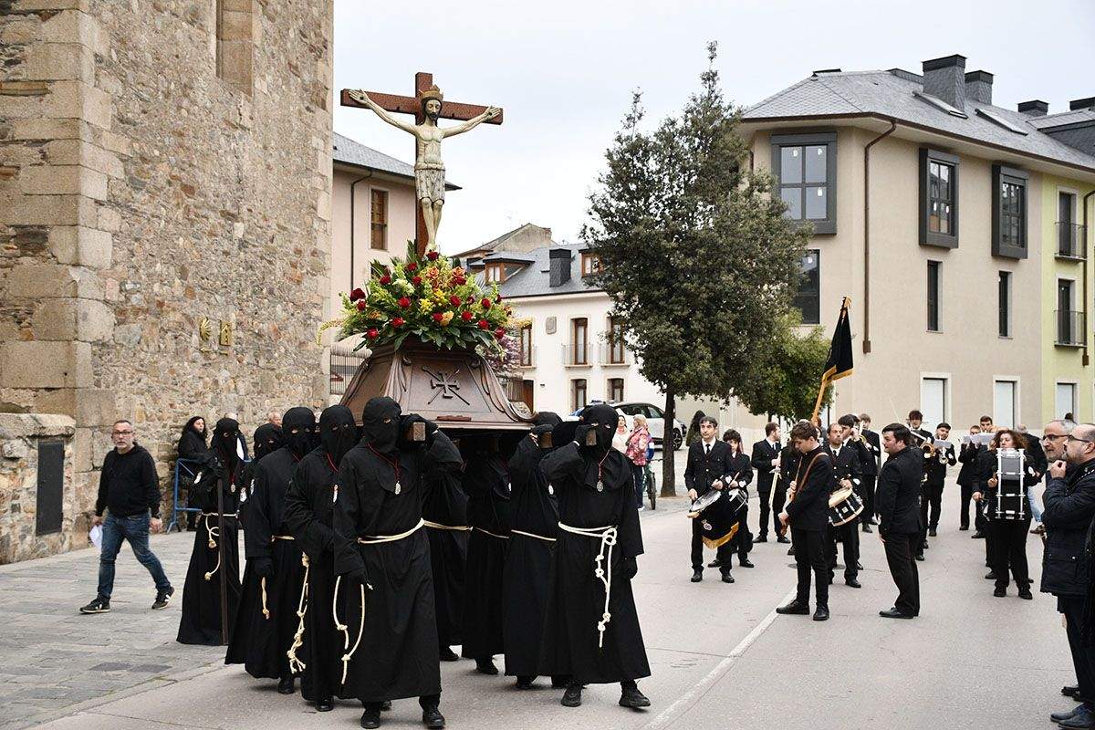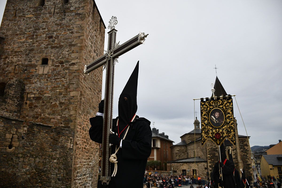 Esta procesión se recuperó hace nueve años, en 2014, con el objetivo de impulsar la declaración de la Semana Santa de Ponferrada como de Interés Turístico Nacional y que obtuvo al año siguiente. Su origen se remonta a los años 40 del siglo pasado y se desarrollaba por el casco antiguo de la ciudad con grandes cruces colocadas en algunas de sus fachadas. No había paso y era el mayordomo quien iniciaba el recorrido con un crucifijo de mano hasta la primera estación, cuando lo pasaba a otro de los hermanos que se iban alternando para llevarlo en las diferentes estaciones del Vía Crucis hasta finalizar otra vez en la basílica de La Encina.