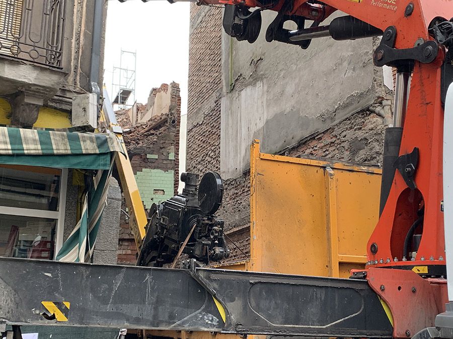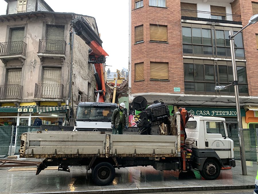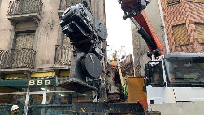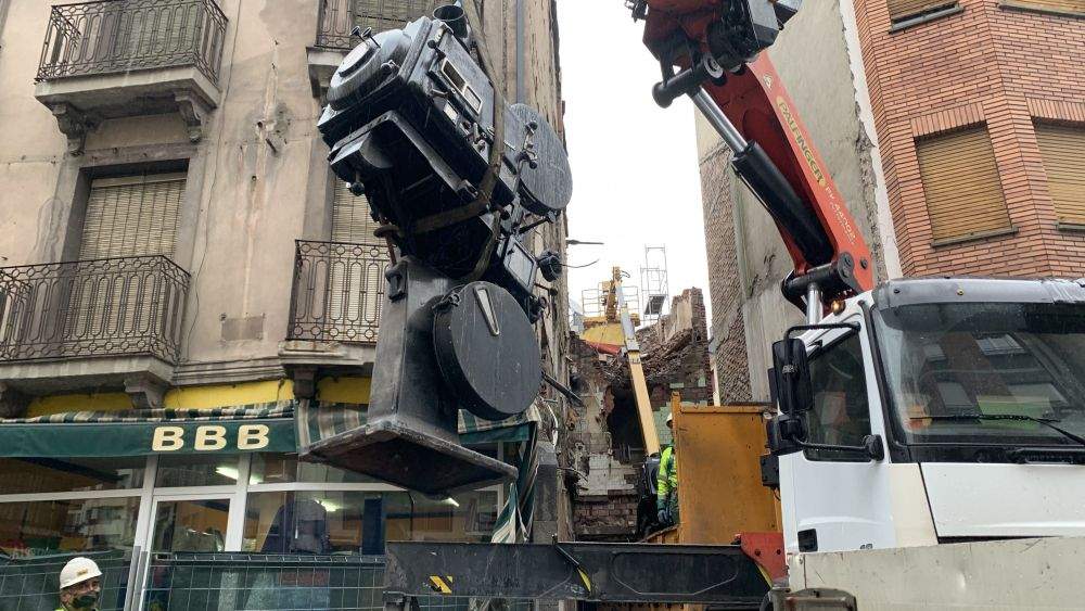 Más de una hora pasaron las dos máquinas bajo una lluvia intensa e incesante, desde que fueron extraídas del edificio en proceso de demolición, pasando de un camión grúa al camión de los servicios de limpieza del Ayuntamiento que se las llevaron de la calle del Cristo en el centro de la ciudad, para no volver. "Cae agua como si no hubiera un mañana", comentó uno de los allí presentes, pues además de los técnicos y obreros y la prensa, fueron muchos los curiosos que se mantuvieron bajo el chaparrón para ser testigos del histórico acontecimiento.