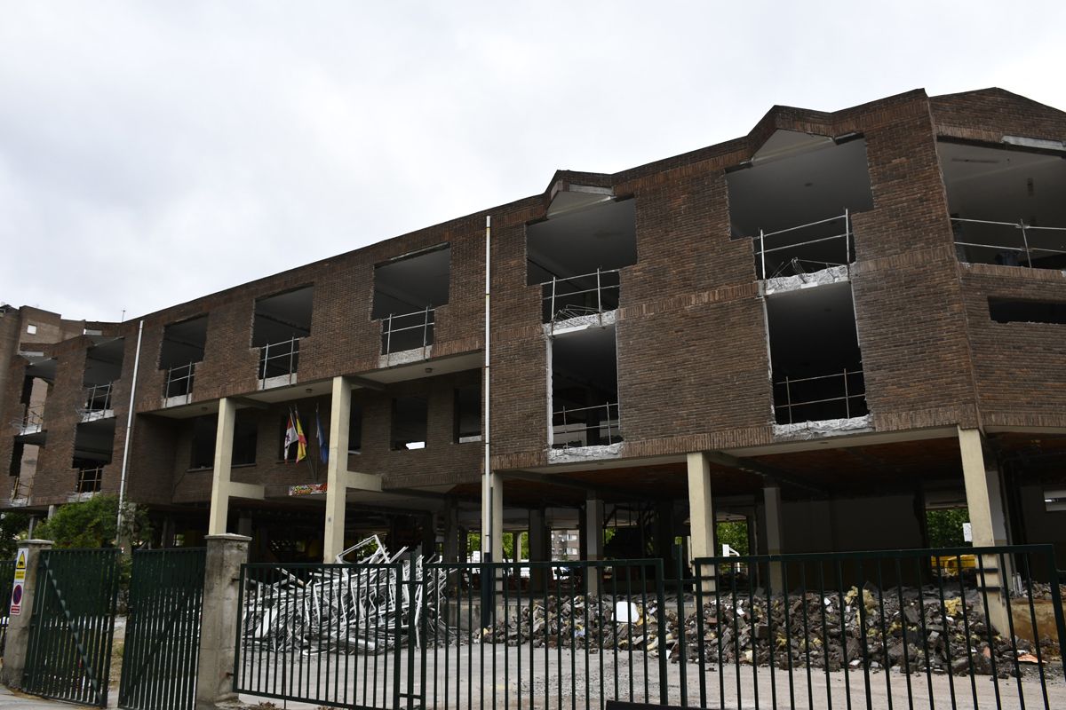 La infraestructura de la Escuela Hogar de Ponferrada en la Avenida del Reino de León ya casi es historia urbana. Las obras del futuro Colegio Mayor de la ULE en el Campus de Ponferrada han comenzado, por lo que el edificio que durante años sirvió de espacio educativo y alojamiento para estudiantes, ahora está 'en los huesos' esperando su reconversión.