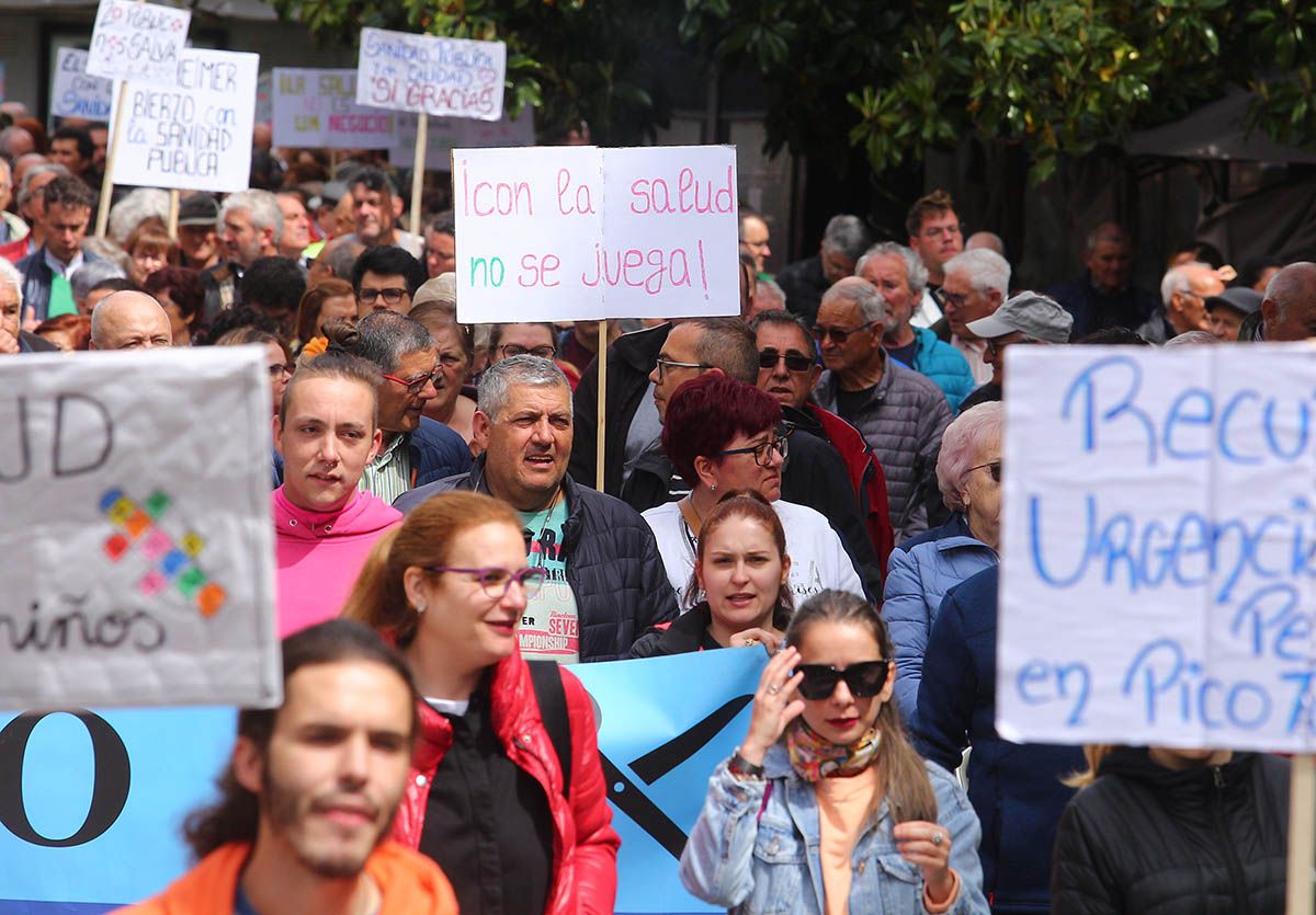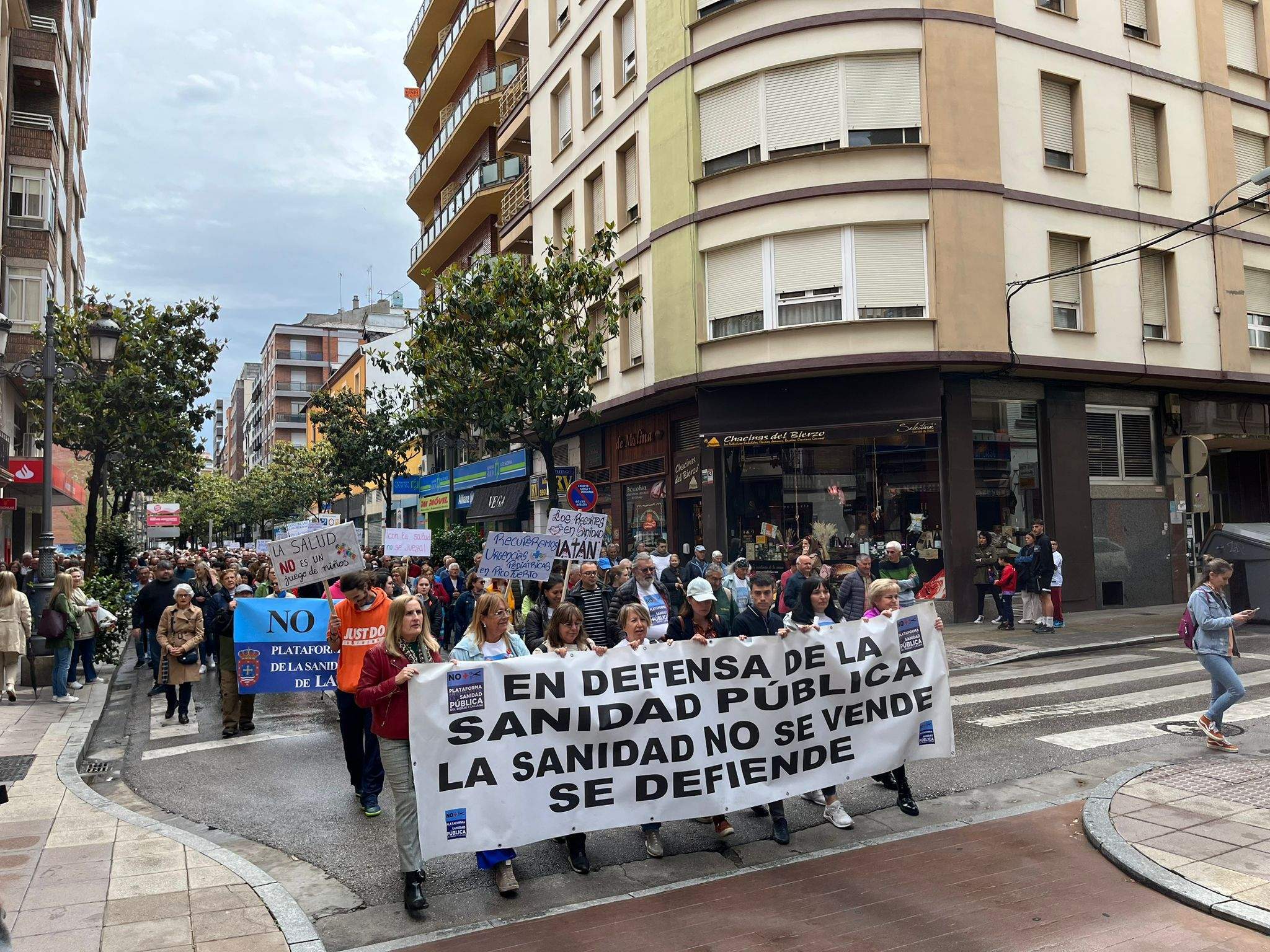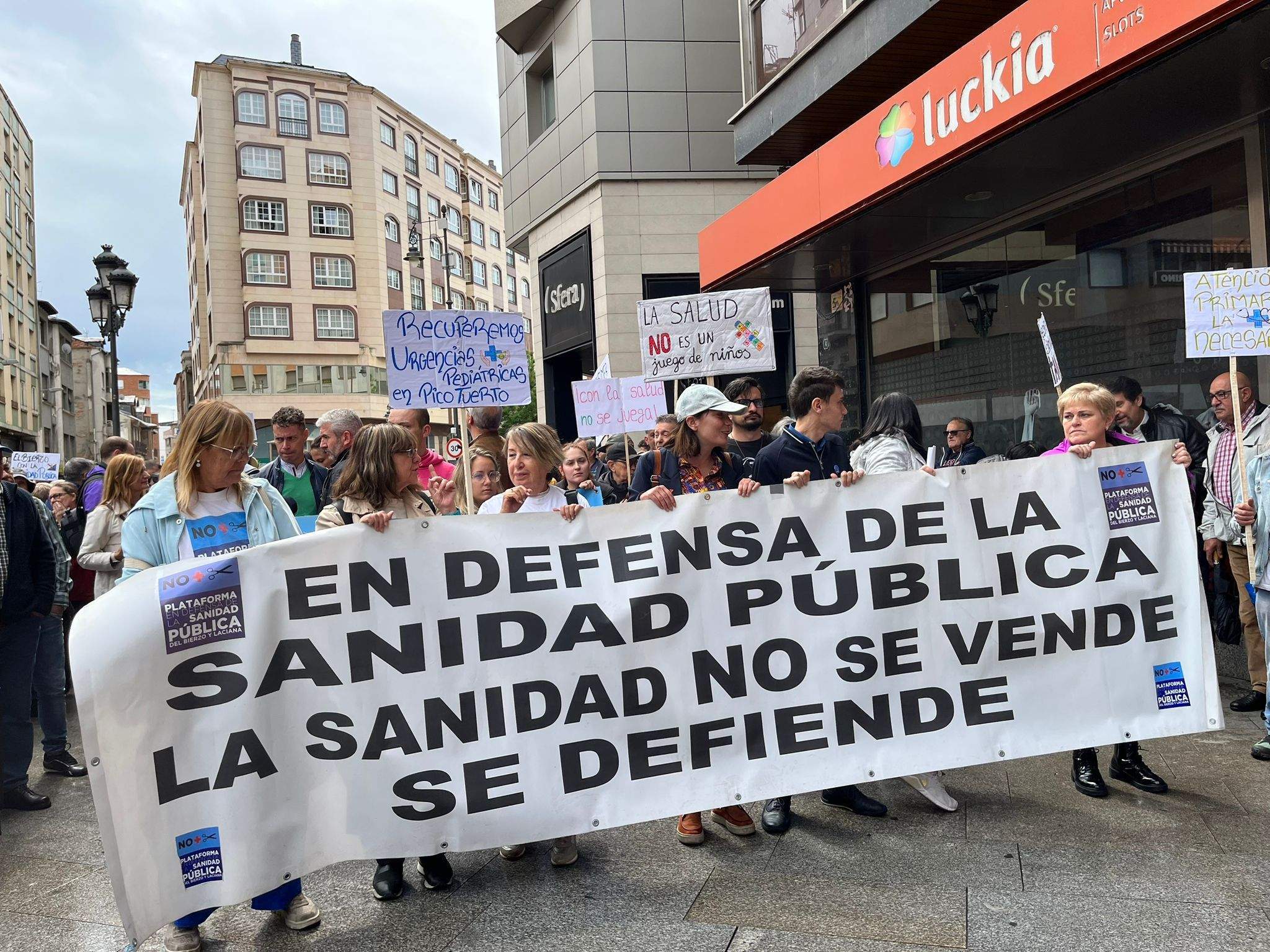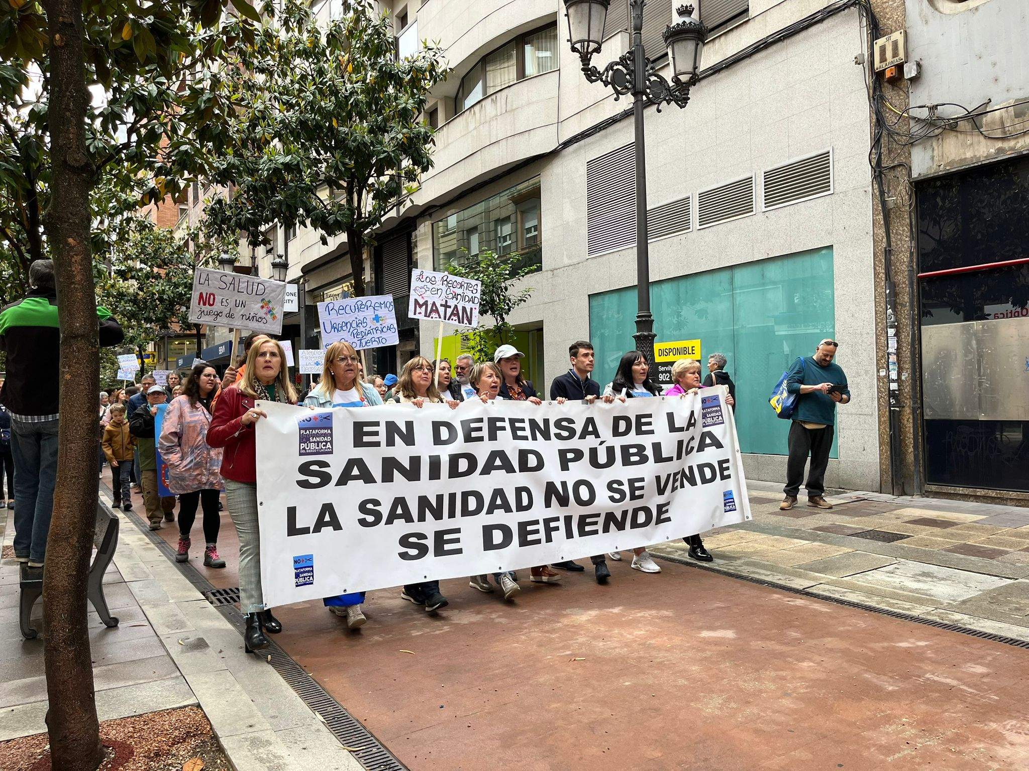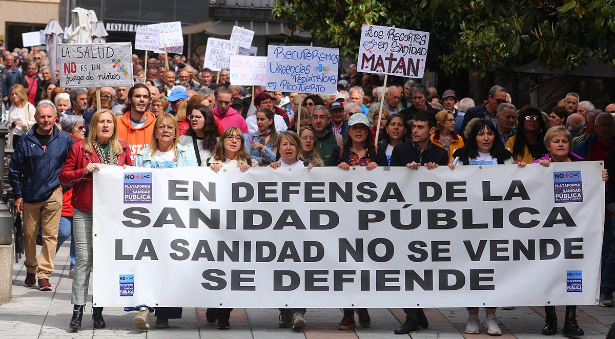 Aunque en varias capitales y ciudades de la Comunidad, en la capital berciana ha contado con la presencia de sindicatos, políticos, y cientos de vecinos que encabezados por la Plataforma han solicitado el "regreso de las urgencias pediátricas a Picotuerto", que "se deje de externalizar servicios con conciertos público-privados como el caso de los rayos, o en un futuro cercano, de la radioterapia, que se cubran las plazas vacantes y se palie la escasez de profesionales sanitarios" y que "el consejero de Sanidad, Alejandro Vázquez, dimita".