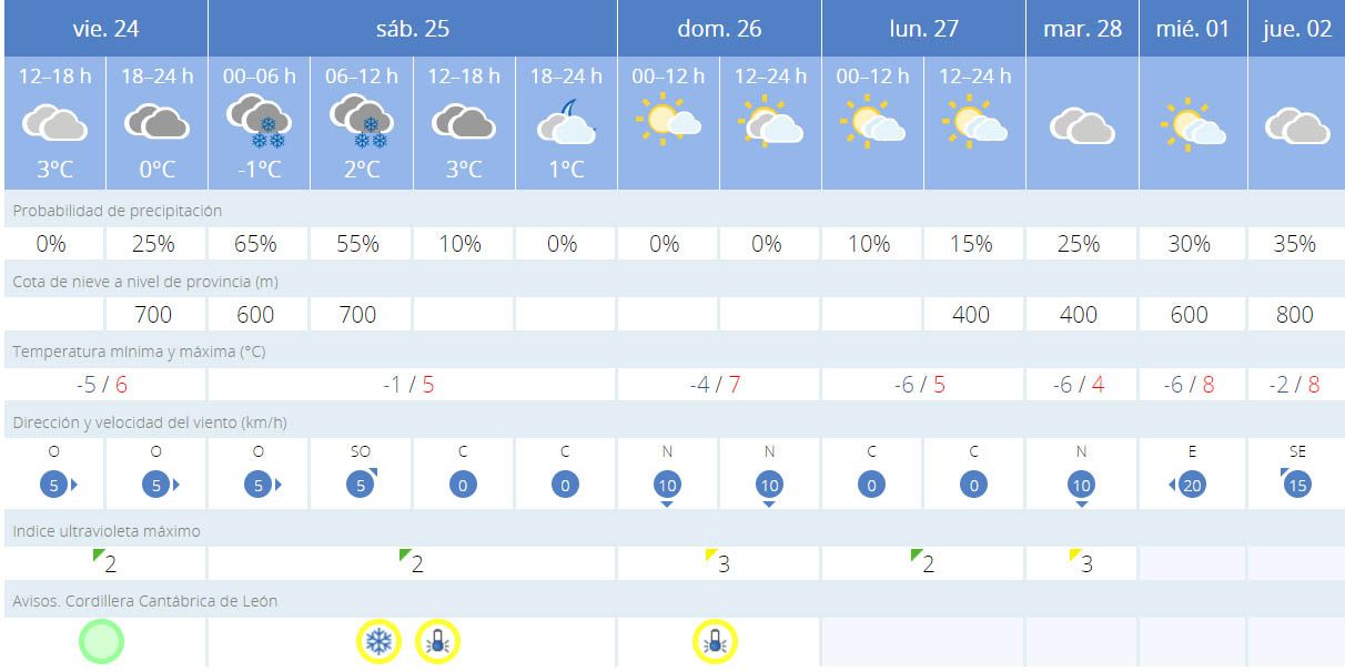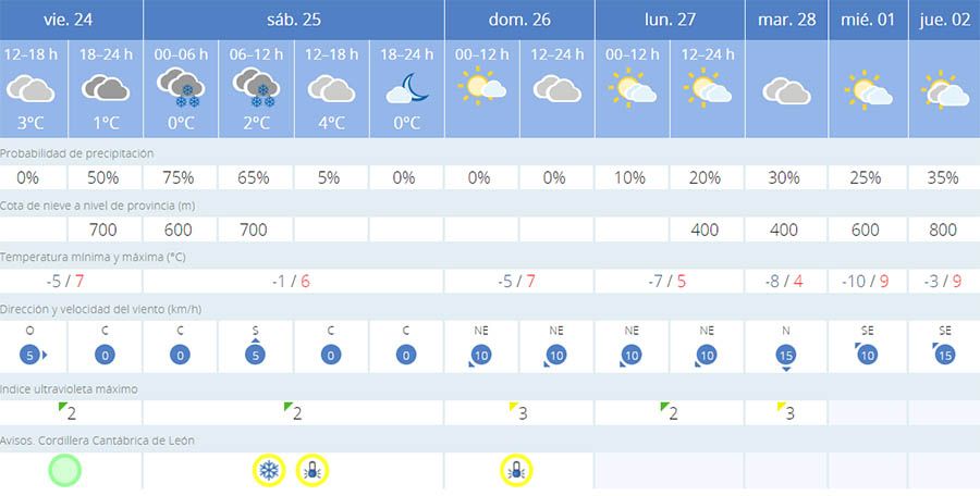 Los avisos amarillos por nieve y baja temperatura se volverán a activar por AEMET en Páramo del Sil, para el sábado y domingo. Respecto a las temperaturas, cifrarán marcas mínimas por debajo de los 0 grados. En lo que respecta a precipitaciones por nieve, se producirán, en previsión, durante la jornada del sábado.