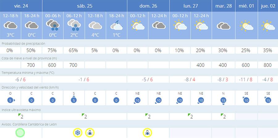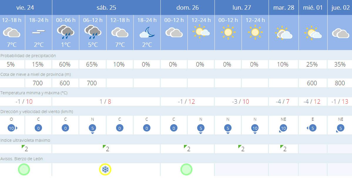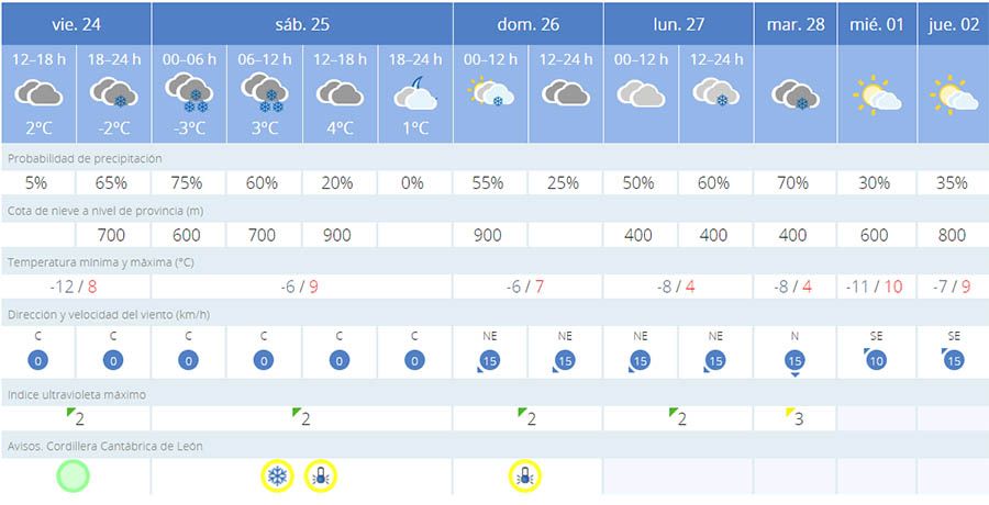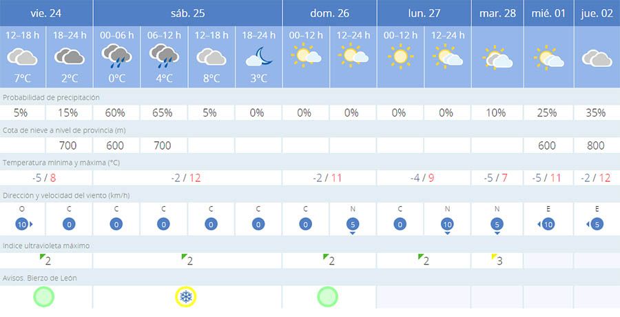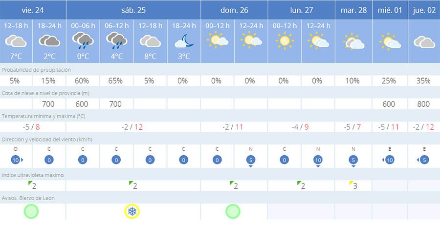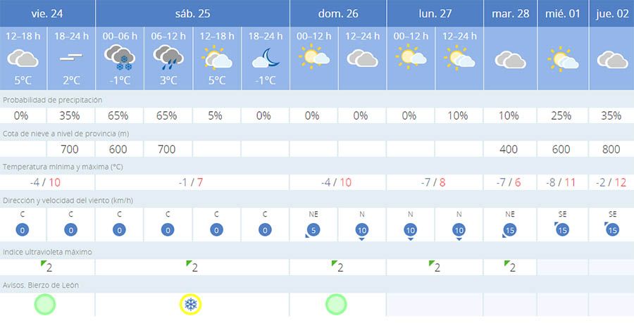 En la capital del Bierzo alto, la nieve podría hacer acto de presencia este sábado con una cota de nieve a 600 metros. Respecto a las temperaturas volverán a marcas cifras negativas pudiendo registrar mínimas de -2 grados. La AEMET también ha establecido aviso amarillo por nieve para el sábado, 24 de febrero.