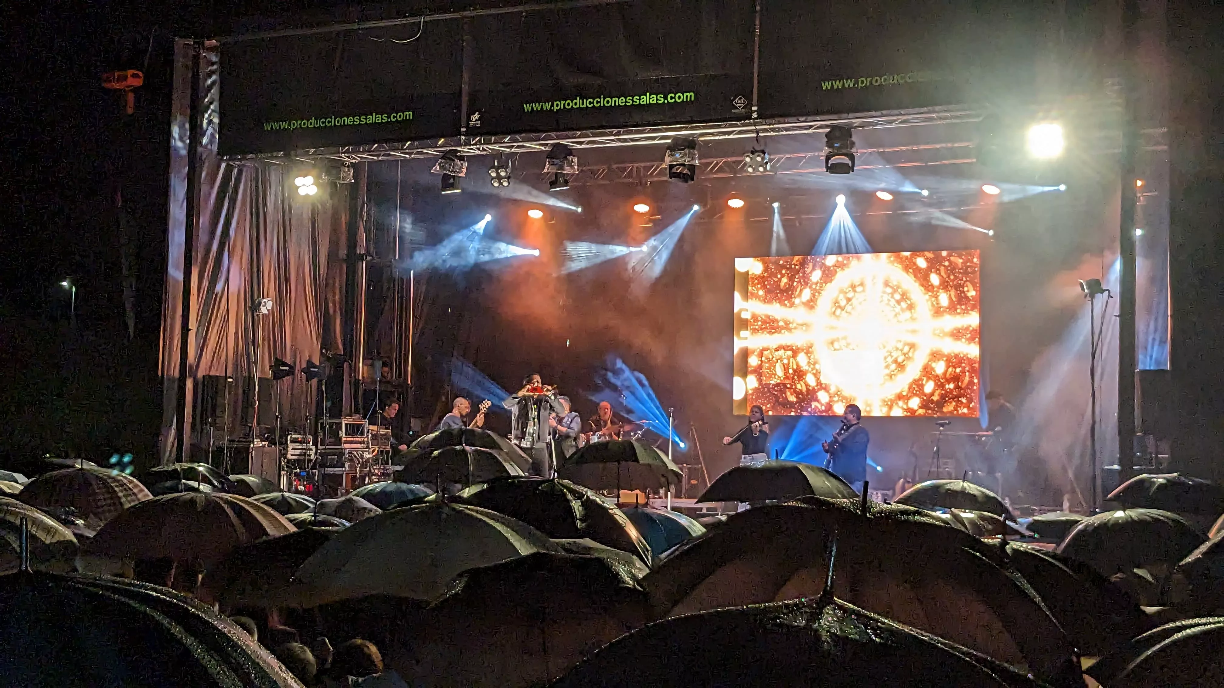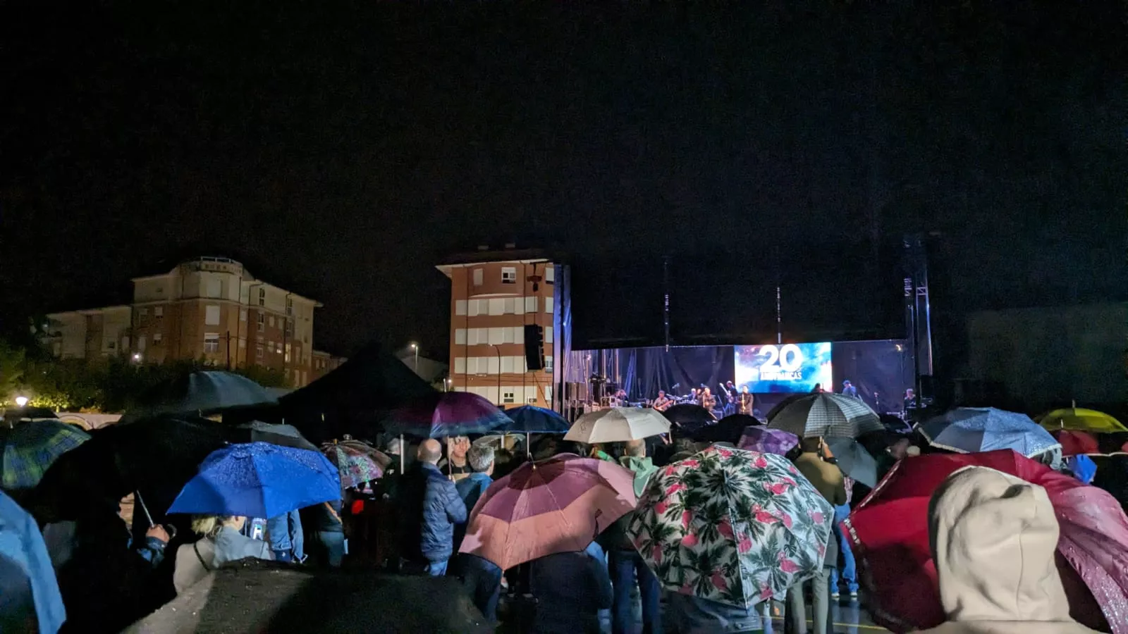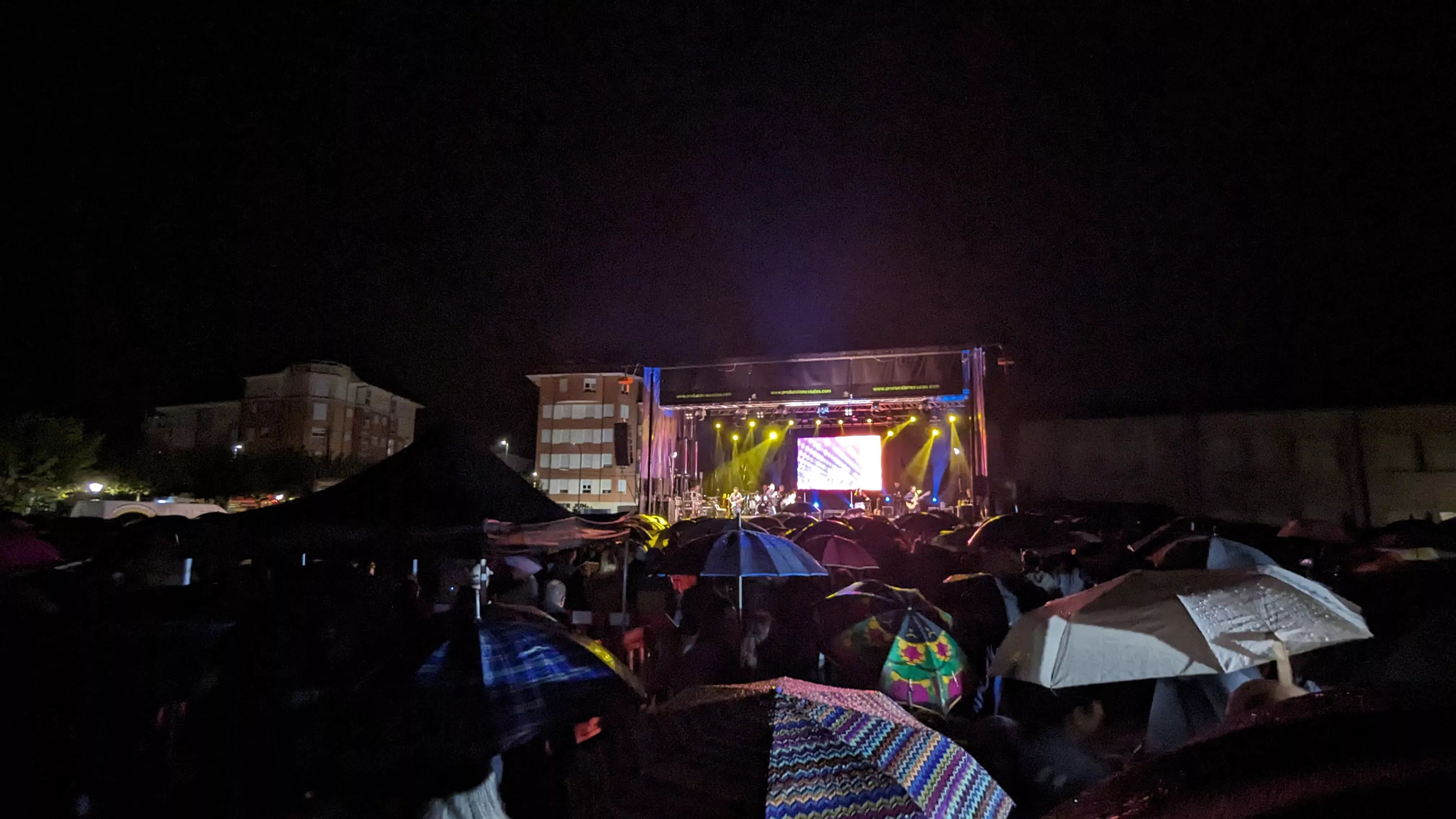 No podían faltar ‘Son de Amores’, 'Tanto la quería', ‘Aquí Sigo Yo’, ‘Pido la palabra’ y ‘El Ritmo de las Olas’, durante el concierto no cantaron solos, les acompañaban los bercianos reunidos en el patio del colegio Virgen de la Peña, aunque entre paraguas, la lluvia no les impidió disfrutar de una de las noches grandes de las Fiestas del Cristo.