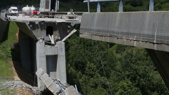 Las obras de reparación que desde junio del año pasado se llevan a cabo en el viaducto del Castro de la autovía A-6, a la altura del municipio berciano de Vega de Valcarce, sufrieron hoy un aparatoso derrumbe cuando una de las vigas que sujeta el tablero del puente se rompió por causas que aún se desconocen y provocó el hundimiento del tercer vano del viaducto. Según subrayaron fuentes de la Subdelegación del Gobierno en León, el suceso no provocó ningún daño personal, ya que la calzada afectada se encuentra cortada al tráfico.