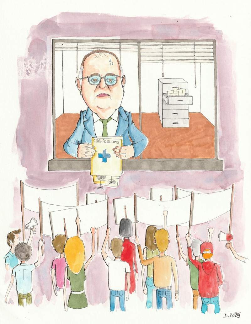 Esta viñeta traza esa movilización social a la que atiende el consejero, pero con la carpeta de currículums vacía.