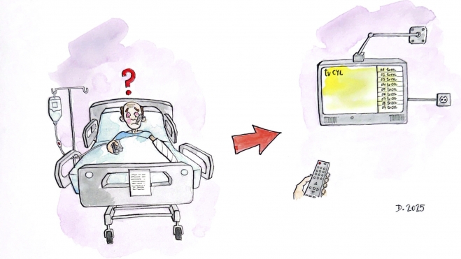 Por ejemplo, esta semana se hace eco de la noticia sobre la gratuidad de la televisión en el Hospital del Bierzo desde el próximo año. Pues ya le sacamos punta al tema, y nuestro dibujante de cabecera, Daniel Buitrón, se pregunta si sintonizará un sólo canal (le hemos llamado Canal La Castilla), a fin de elevar así la cuota de pantalla del '0.7%' (si fuera un caso semejante a otro real :-)
