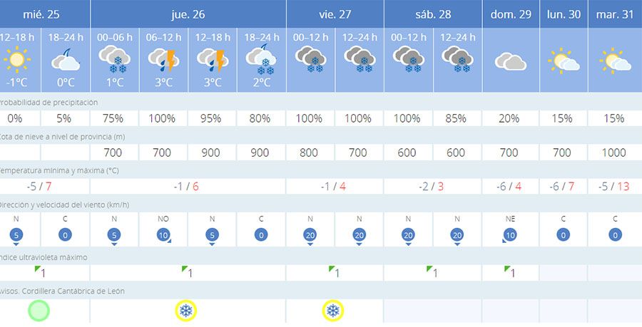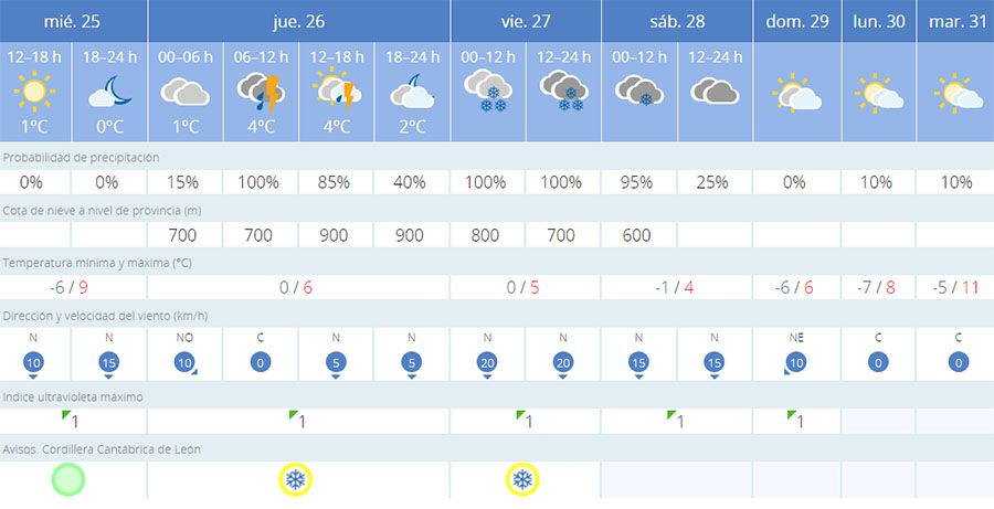 En la localidad berciana de Páramo de Sil, la Agencia Estatal de Meteorología establebe la alerta amarilla por nieve para los días 26 y 27 de enero (jueves y viernres). Por lo tanto, los cielos despejados abandonarán este punto de la Comarca para dar paso a un nuevo episodio de nevadas, y bajas temperaturas, con mínimas que podrán bajar de los cero grados. Además, AEMET fija la probabilidad de precipitación al 100% para el viernes, 27 de enero. Con respecto a las mínimas, ninguna superará los 8 grados.