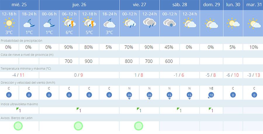 En la capital de Laciana se producirán fuertes nevadas tanto el viernes como el sábado 28 de enero, marcando el 100% de probabilidad de precipitación. En esta línea, los termómetros seguirán marcado gélidas temperaturas que bajarán de los cero grados (las mínimas) y las máximas no superarán los 4º centígrados en ninguna jornada hasta después del fin de semana. Así, la AEMET ha notificado alerta amarilla por nieve en Villablino para el jueves 26 de enero y viernes 27, hasta el momento.