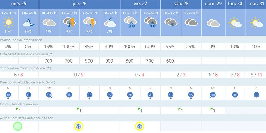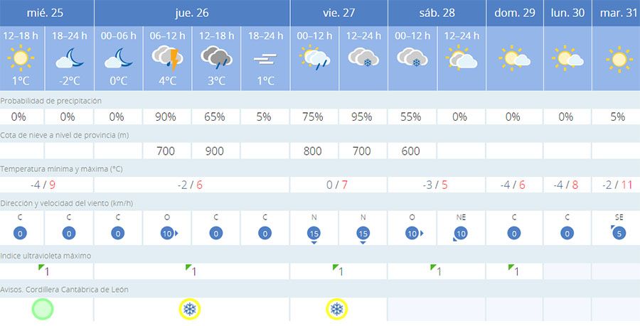 En la localidad berciana de Páramo de Sil, la Agencia Estatal de Meteorología establebe la alerta amarilla por nieve para los días 26 y 27 de enero (jueves y viernres). Por lo tanto, los cielos despejados abandonarán este punto de la Comarca para dar paso a un nuevo episodio de nevadas, y bajas temperaturas, con mínimas que podrán bajar de los cero grados. Además, AEMET fija la probabilidad de precipitación al 100% para el viernes, 27 de enero. Con respecto a las mínimas, ninguna superará los 8 grados.